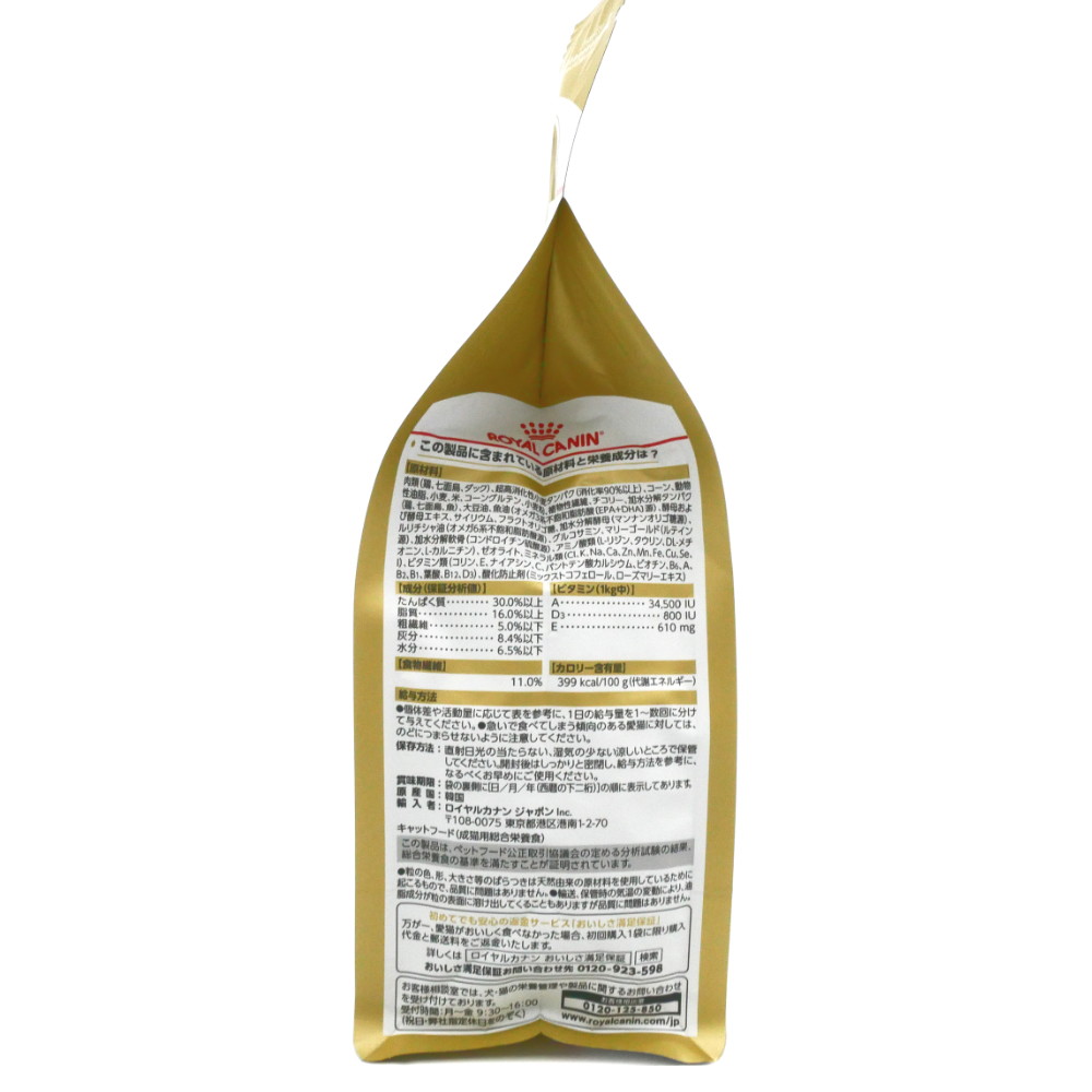 | 原材料 | 肉類(鶏、七面鳥)、とうもろこし、植物性分離タンパク*、動物性脂肪、小麦、コーングルテン、米、加水分解タンパク(鶏、七面鳥)、植物性繊維、小麦粉、チコリパルプ、魚油(オメガ3系不飽和脂肪酸(EPA/DHA)源)、大豆油、フラクトオリゴ糖、サイリウム、加水分解酵母(マンナンオリゴ糖源)、ルリチシャ油(オメガ6系不飽和脂肪酸源)、加水分解甲殻類(グルコサミン源)、マリーゴールド抽出物(ルテイン源)、加水分解軟骨(コンドロイチン硫酸源)、アミノ酸類(L-リジン、DL-メチオニン、タウリン、L-カルニチン)、ゼオライト、ミネラル類(Cl、Ca、K、Na、Zn、Mn、Fe、Cu、I、Se)、ビタミン類(A、コリン、D3、イノシトール、E、ナイアシン、C、パントテン酸カルシウム、B6、B2、B1、葉酸、ビオチン、B12)、酸化防止剤(BHA、没食子酸プロピル) *超高消化性タンパク(消化率90%以上) ・粒の色、形、大きさ等のばらつきは天然由来の原材料を使用しているために起こるもので、品質に問題はありません。 ・輸送、保管時の気温の変動により、油脂成分が粒の表面に溶け出してくることもありますが品質に問題はありません。 |