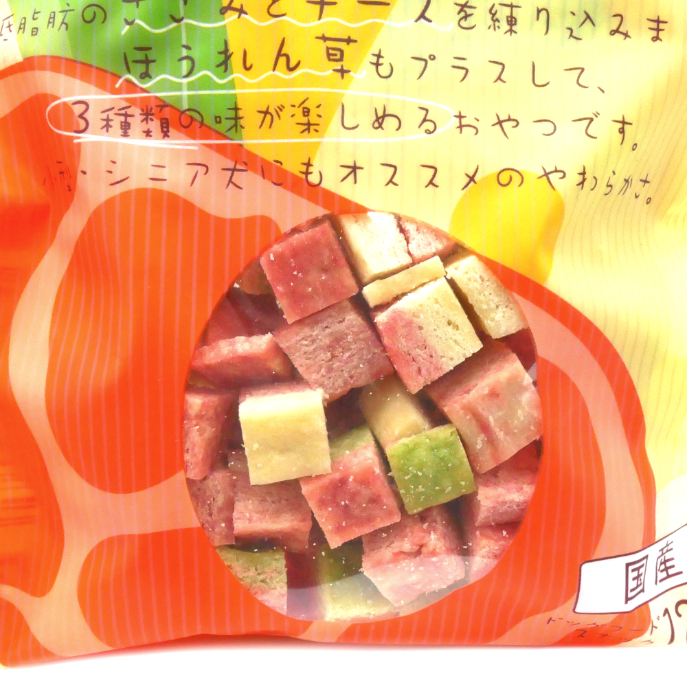 | 原材料 | 小麦粉、鶏肉、鶏ささみ、チーズ、牛肉、でん粉類、ほうれん草、ソルビトール、グリセリン、膨張剤、着色料(赤106、黄4、黄5、青1、酸化チタン)、保存料(ソルビン酸K)、pH調整剤、食塩、酸化防止剤(エリソルビン酸Na)、香料 | ||||||||||||