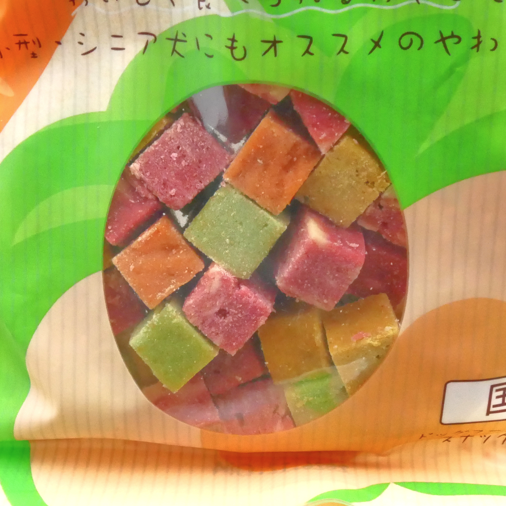 | 原材料 | 小麦粉、鶏ささみ、鶏肉、脱脂大豆、糖類、じゃがいも でん粉、小麦グルテン、バターミルクパウダー、牛脂、野菜(かぼちゃ、にんじん、キャベツ、ほうれん草)、ビーフパウダー、フィッシュパウダー、プロピレングリコール、ソルビトール、ミネラル・ビタミン類、リン酸塩(Na)、保存料(ソルビン酸K、デヒドロ酢酸Na)、食塩、酸化防止剤(エリソルビン酸Na)、着色料(酸化チタン、黄4、黄5、赤2、赤102、赤106、青1) | ||||||||||||