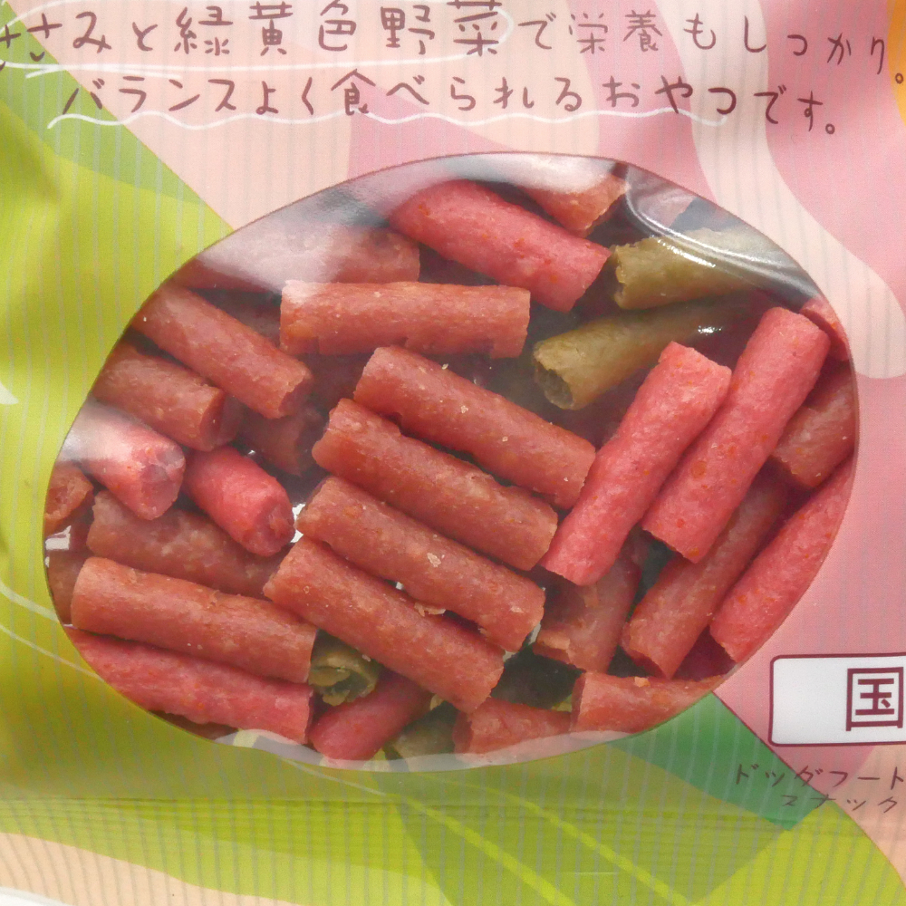 | 原材料 | 肉類(鶏肉、鶏ささみ)、小麦粉、植物たん白、パン粉、糖類、植物油脂、脱脂大豆、ビール酵母、にんじん、ほうれん草、ソルビトール、ミネラル類(カルシウム、Na、亜鉛、ヨウ素)、プロピレングリコール、ビタミン類(A、B1、B2、B6、B12、D3、E、ナイアシン、パントテン酸)、着色料(赤色106、黄4、青1、二酸化チタン)、保存料(ソルビン酸、デヒドロ酢酸Na)、膨張剤、ポリリン酸Na、pH調整剤、くん液、発色剤(亜硝酸Na) | ||||||||||||