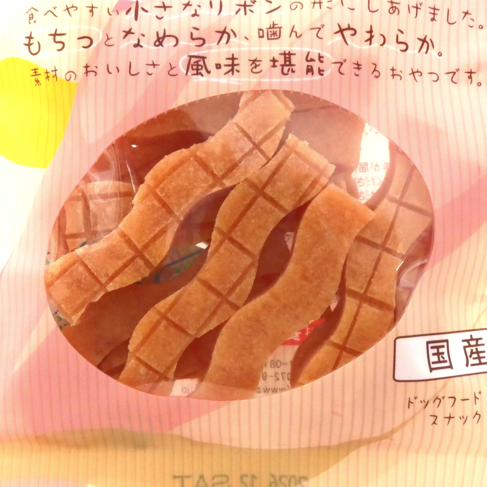 鶏ささみを丁寧に練りこんで、食べやすい小さなリボンの形に仕上げました。