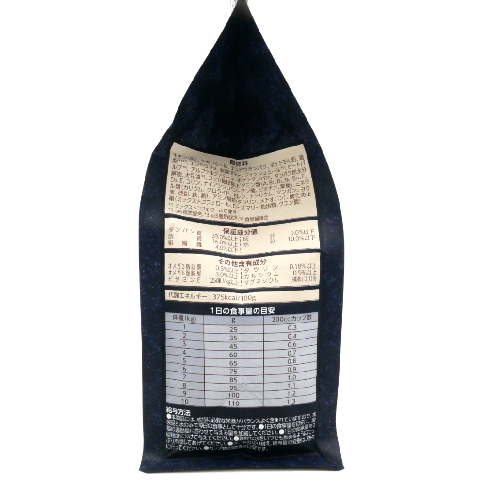 | 原材料 | チキン(肉)、チキンミール、エンドウタンパク、ポテトスターチ、鶏脂* 、乾燥ポテト、エンドウマメ、フィッシュミール、アルファルファミール、ビートパルプ、ポテトタンパク、タンパク加水分解物、大豆油*、ユッカ抽出物、ビタミン類(A、B1、B2、B6、B12、C、D3、E、コリン、ナイアシン、パントテン酸、ビオチン、葉酸)、ミネラル類(カリウム、クロライド、セレン、ナトリウム、マンガン、ヨウ素、亜鉛、鉄、銅)、アミノ酸類(タウリン、メチオニン)、酸化防止剤(クエン酸、ミックストコフェロール、ローズマリー抽出物) *ミックストコフェロールで保存 |