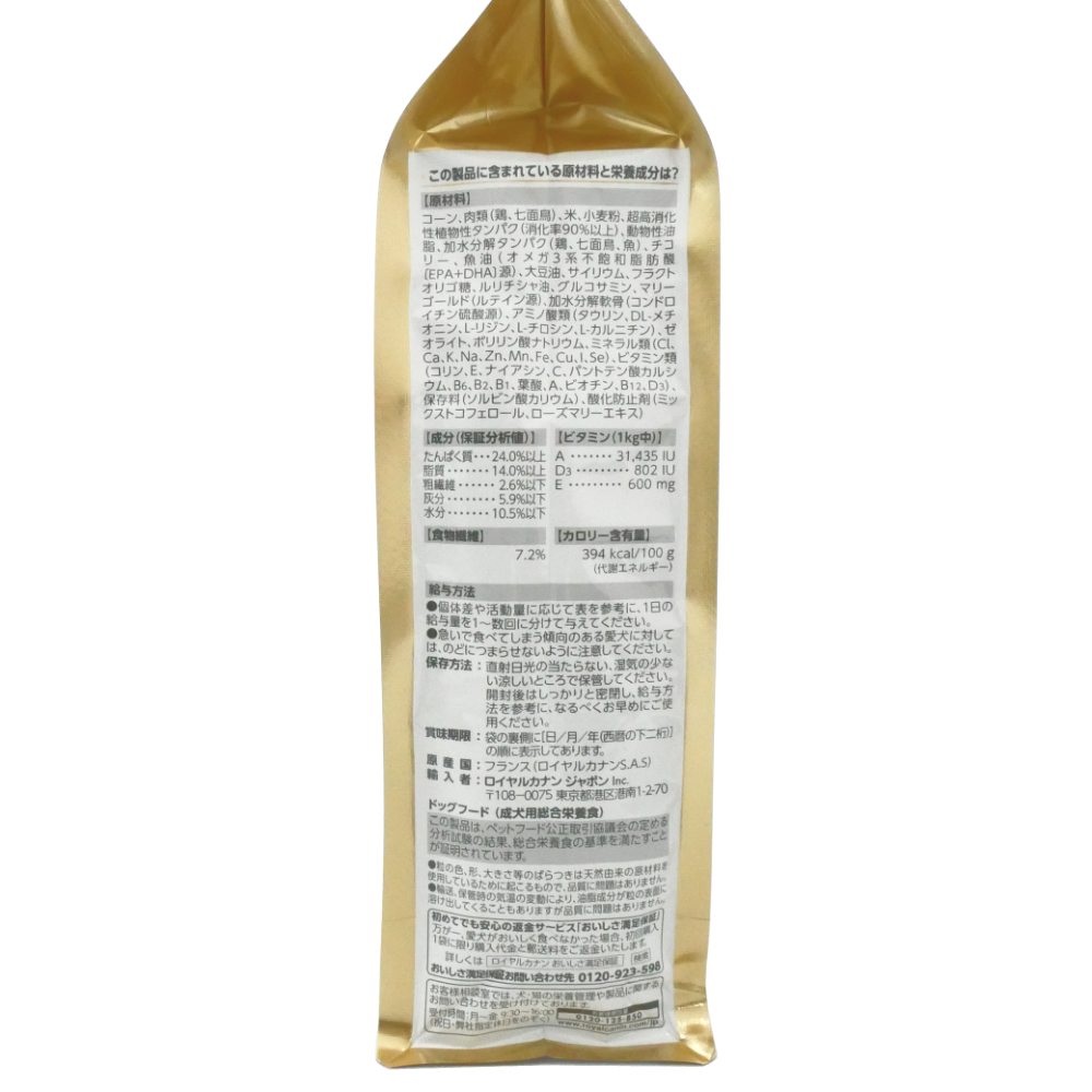 | 原材料 | コーン、肉類(鶏、七面鳥)、米、小麦粉、超高消化性植物性タンパク(消化率90%以上)、動物性油脂、加水分解タンパク(鶏、七面鳥、魚)、チコリー、魚油(オメガ3系不飽和脂肪酸〔EPA+DHA〕源)、大豆油、サイリウム、フラクトオリゴ糖、ルリチシャ油、グルコサミン、マリーゴールド(ルテイン源)、加水分解軟骨(コンドロイチン硫酸源)、アミノ酸類(タウリン、DL-メチオニン、L-リジン、L-チロシン、L-カルニチン)、ゼオライト、ポリリン酸ナトリウム、ミネラル類(Cl、Ca、K、Na、Zn、Mn、Fe、Cu、I、Se)、ビタミン類(コリン、E、ナイアシン、C、パントテン酸カルシウム、B6、B2、B1、葉酸、A、ビオチン、B12、D3)、保存料(ソルビン酸カリウム)、酸化防止剤(ミックストコフェロール、ローズマリーエキス) ・粒の色、形、大きさ等のばらつきは天然由来の原材料を使用しているために起こるもので、品質に問題はありません。 ・輸送、保管時の気温の変動により、油脂成分が粒の表面に溶け出してくることもありますが品質に問題はありません。 |