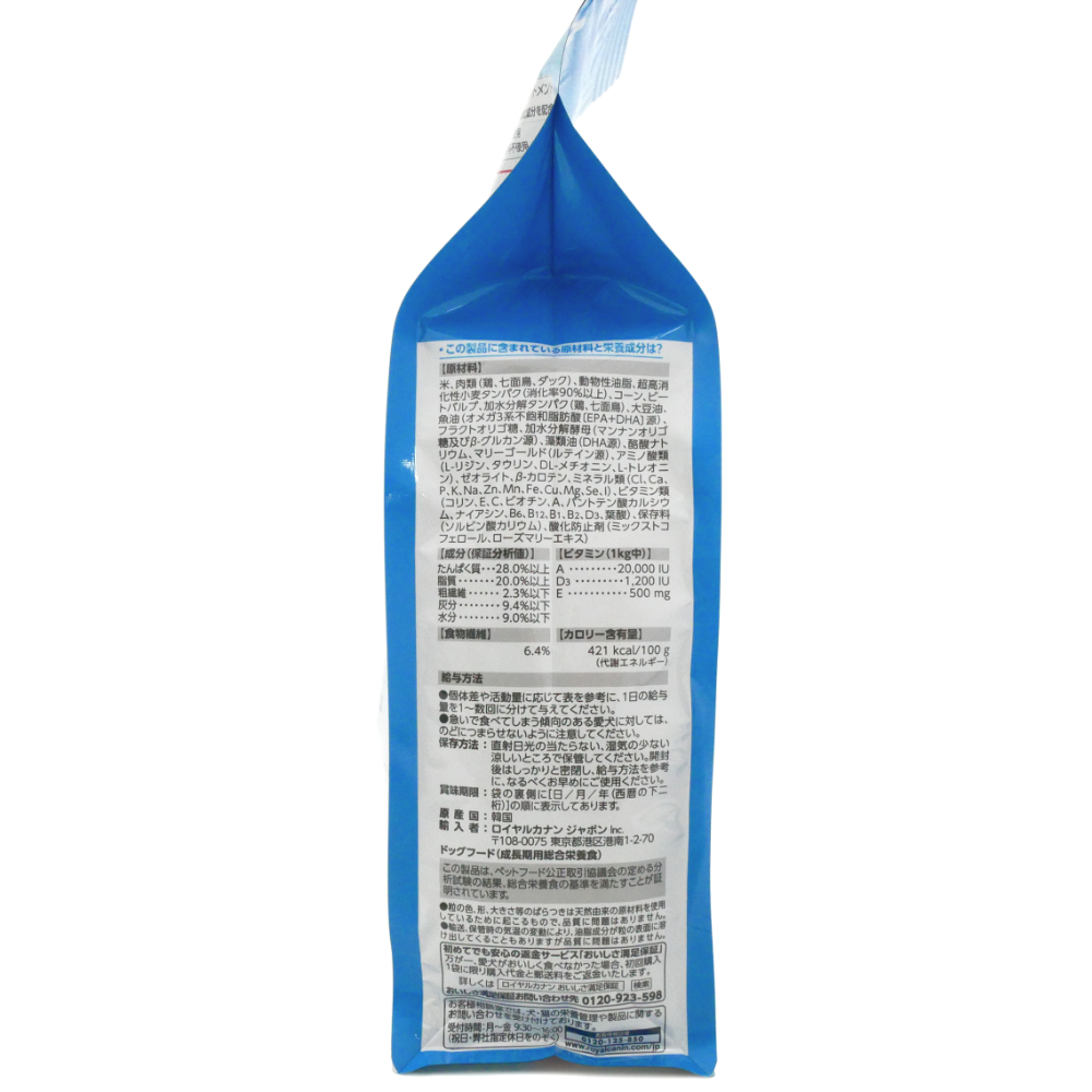 | 原材料 | 家禽*ミート、米、動物性脂肪、植物性分離タンパク**、とうもろこし、ビートパルプ、加水分解動物性タンパク、魚油、大豆油、フラクトオリゴ糖、酪酸ナトリウム、加水分解酵母(マンナンオリゴ糖及びβーグルカン源)、マリーゴールド抽出物(ルテイン源)、アミノ酸類(L-リジン、DL-メチオニン、タウリン、L-カルニチン)、ゼオライト、ミネラル類(K、Cl、P、Na、Ca、Zn、Mn、Fe、Cu、I、Se)、ビタミン類(コリン、E、C、パントテン酸カルシウム、ナイアシン、B6、B1、A、B2、ビオチン、葉酸、B12、D3)、保存料(ソルビン酸カリウム)、酸化防止剤(BHA、没食子酸プロピル) *鶏、七面鳥 **超高消化性タンパク 主原料はすべて天然由来原料を使用しており、着色料を使用していない為、粒の色調等にばらつきがある場合がございますが、品質に問題はありませんので、安心してご利用ください。 |