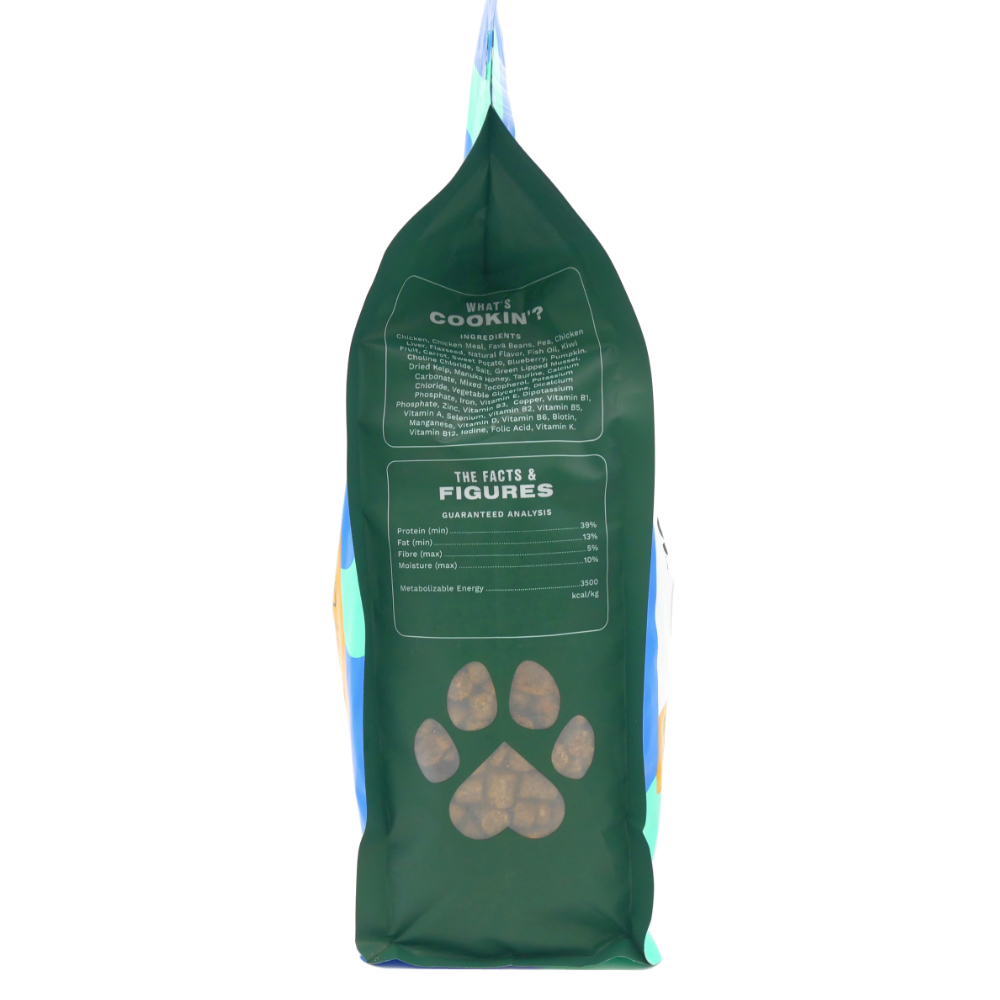 | 原材料 | チキン、チキンミール、ソラマメ、エンドウ、チキン肝臓、亜麻仁、ナチュラルフレーバー、フィッシュオイル、キウイフルーツ、ニンジン、スイートポテト、ブルーベリー、カボチャ、ソルト、緑イ貝、乾燥ケルプ、マヌカハニー、ミックストコフェロール(酸化防止剤)、植物性グリセリン アミノ酸類(タウリン) ビタミン類(塩化コリン、E、B3、B1、A、B2、B5、D、B6、ビオチン、B12、葉酸、K) ミネラル類(炭酸カルシウム、塩化カリウム、リン酸二カルシウム、鉄、リン酸二カリウム、亜鉛、銅、セレン、マンガン、ヨウ素) |