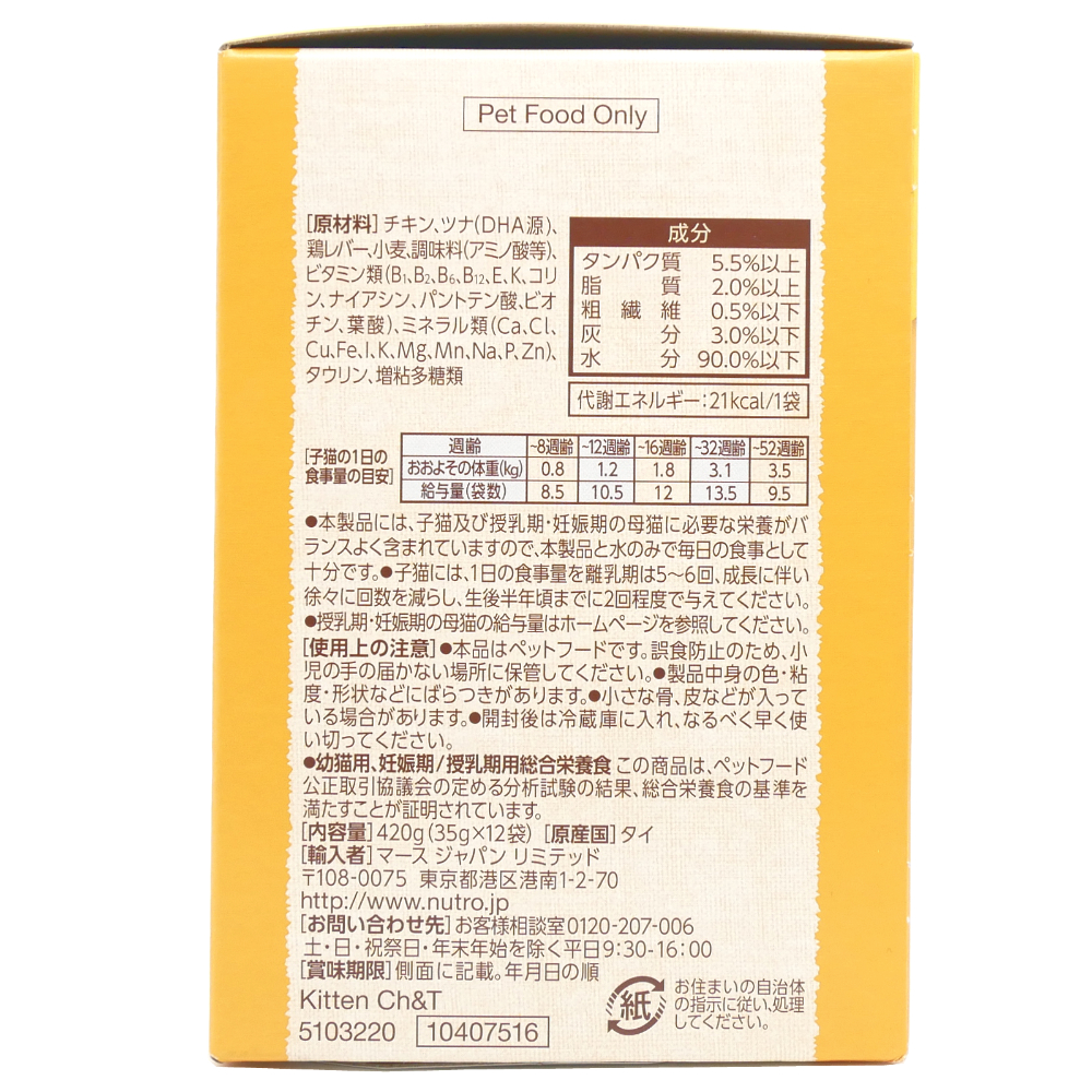 | 原材料 | チキン、ツナ(DHA源)、鶏レバー、小麦、調味料(アミノ酸等)、ビタミン類(B1、B2、B6、B12、E、K、コリン、ナイアシン、パントテン酸、ビオチン、葉酸)、ミネラル類(Ca、Cl、Cu、Fe、I、K、Mg、Mn、Na、P、Zn)、タウリン、増粘多糖類 | ||||||||||||||