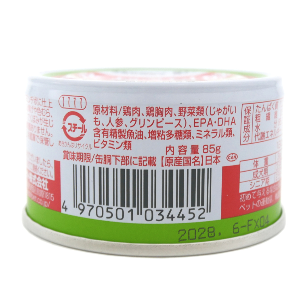 | 原材料 | 鶏肉、鶏胸肉、野菜類(じゃがいも、人参、グリンピース)、EPA・DHA含有精製魚油、増粘多糖類、ミネラル類、ビタミン類 | ||||||||||||||