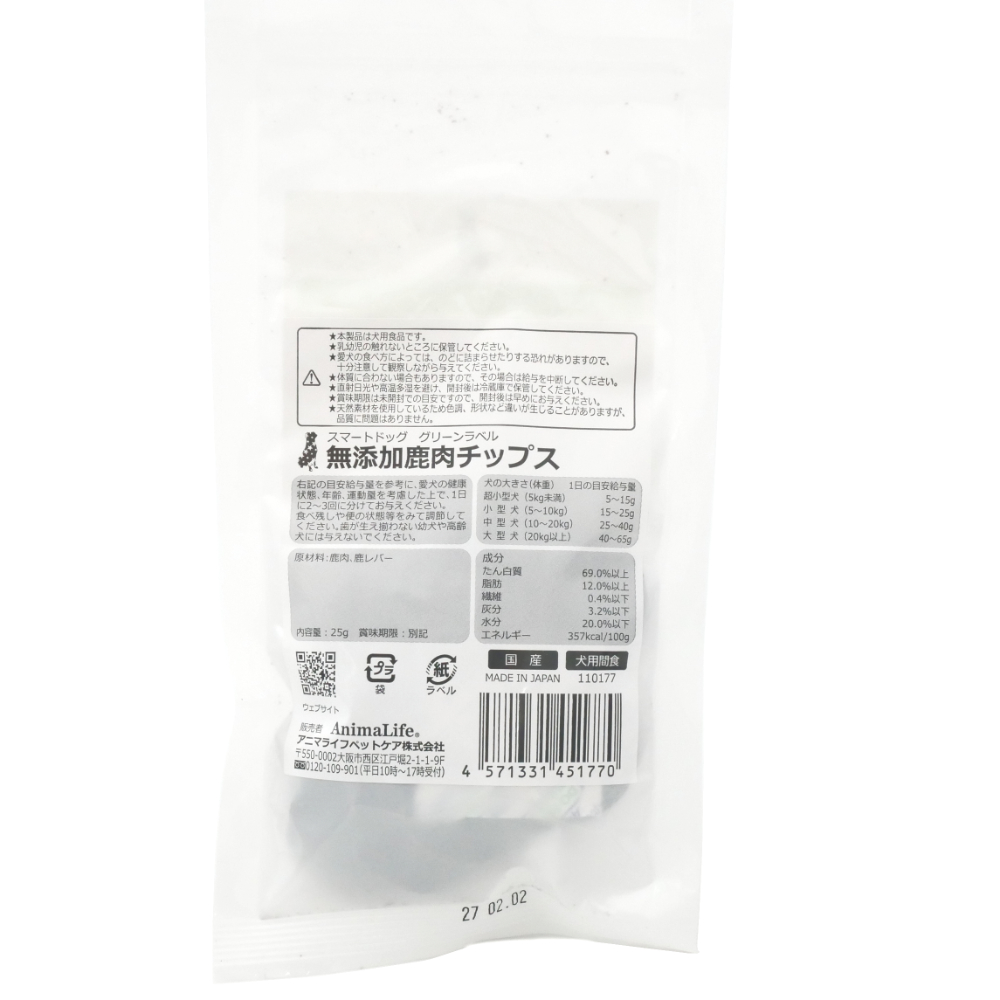 スマートドッグ グリーンラベル 無添加鹿肉チップス
