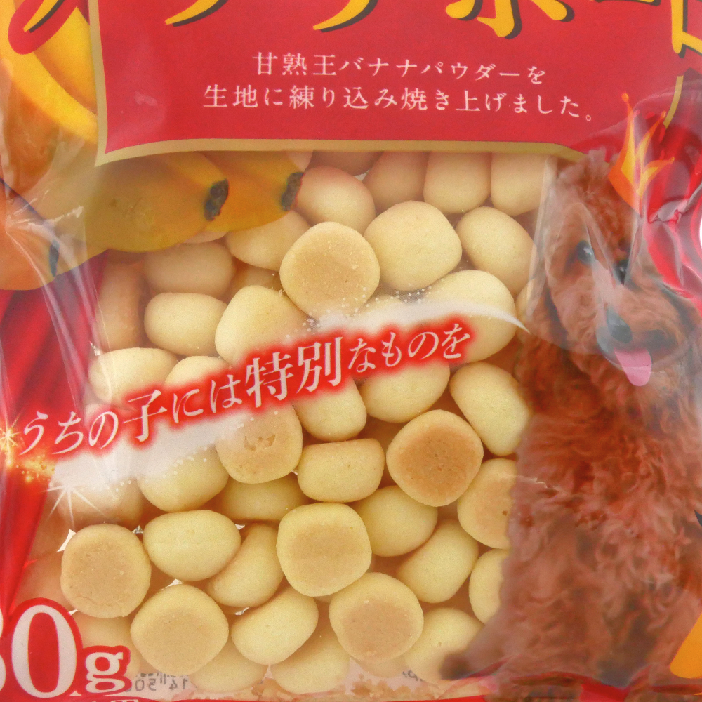 | 原材料 | ばれいじょでん粉(ばれいしょ(北海道))、砂糖、液全卵、ぶどう糖、水飴、バナナ粉末、寒梅粉ミックス(とうもろこしでん紛、もち米)、脱脂粉乳/加工でん紛、香料、カロチノイド色素 | ||||||||||||