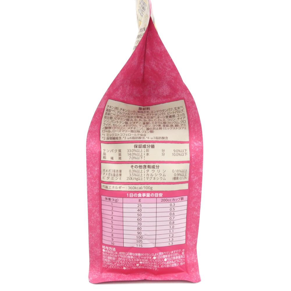 | 原材料 | チキン生肉、乾燥チキン、粗挽き米、エンドウタンパク、玄米、鶏脂*、アルファルファミール、ポテトタンパク、ビートパルプ、亜麻仁、タンパク加水分解物、オーツ麦繊維、大豆油*、ユッカ抽出物、ビタミン類(A、B1、B2、B6、B12、C、D3、E、コリン、ナイアシン、パントテン酸、ビオチン、葉酸)、ミネラル類(カリウム、クロライド、セレン、ナトリウム、マンガン、ヨウ素、亜鉛、鉄、銅)、アミノ酸類(タウリン、メチオニン)、酸化防止剤(ミックストコフェロール、ローズマリー抽出物)、緑茶抽出物、スペアミント抽出物 * ミックストコフェロールで保存 |