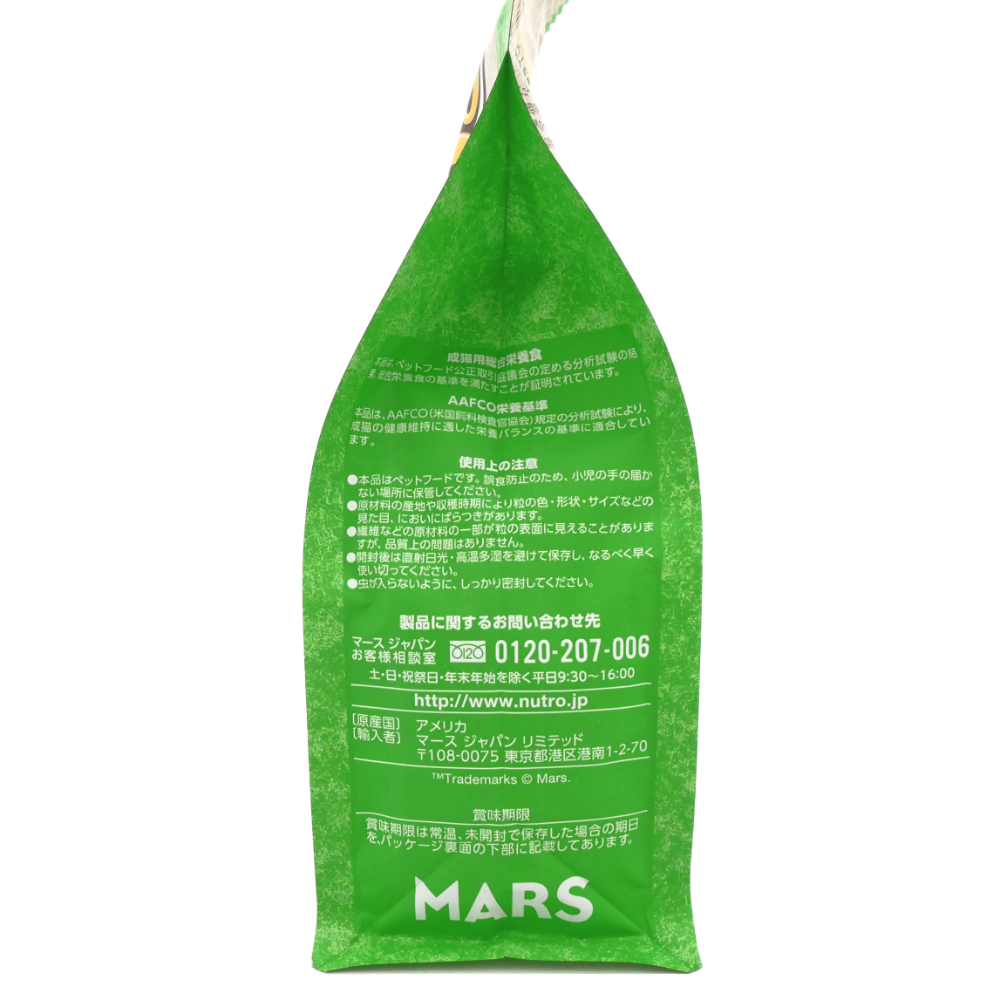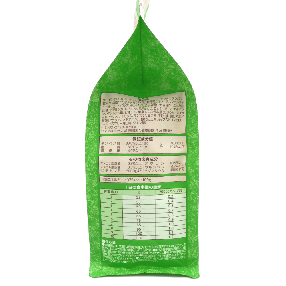 | 原材料 | 生サーモン、乾燥チキン、粗挽き米、エンドウタンパク、鶏脂*、玄米、ポテトタンパク、オートミール、ビートパルプ、アルファルファミール、タンパク加水分解物、大豆油*、ユッカ抽出物、ビタミン類(A、B1、B2、B6、B12、C、D3、E、コリン、ナイアシン、パントテン酸、ビオチン、葉酸)、ミネラル類(カリウム、クロライド、セレン、ナトリウム、マンガン、ヨウ素、亜鉛、鉄、銅)、アミノ酸類(タウリン、メチオニン)、酸化防止剤(ミックストコフェロール、ローズマリー抽出物)、緑茶抽出物、スペアミント抽出物 * ミックストコフェロールで保存 |